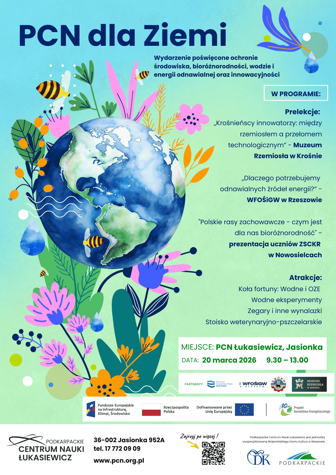 20 marca 2026 r., z okazji Światowego Dnia Wody i Godziny dla Ziemi zapraszamy, wspólnie z Podkarpackim Centrum Nauki „Łukasiewicz”, na wyjątkowe wydarzenie pn.: „PCN dla Ziemi”.