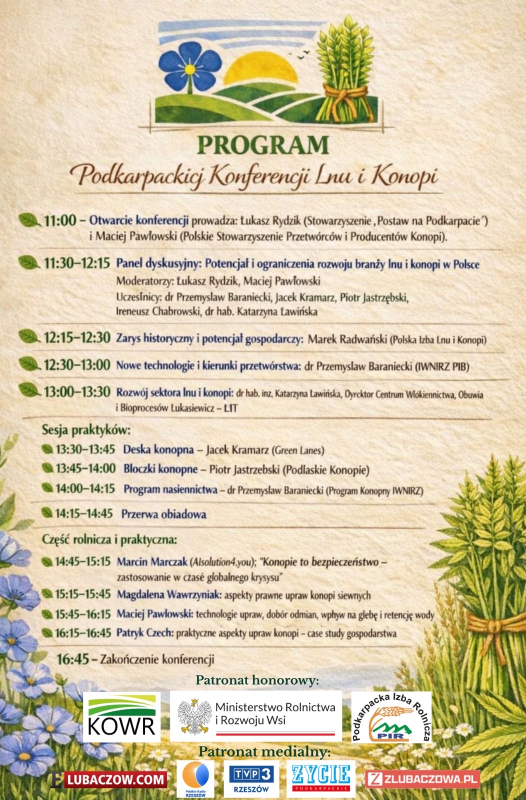 Wojewódzki Fundusz Ochrony Środowiska i Gospodarki Wodnej w Rzeszowie informuje, że w dniu 10 kwietnia 2026 r. w Zespole Szkół Centrum Kształcenia Rolniczego w Oleszycach odbędzie się Podkarpacka Konferencja Lnu i Konopi.